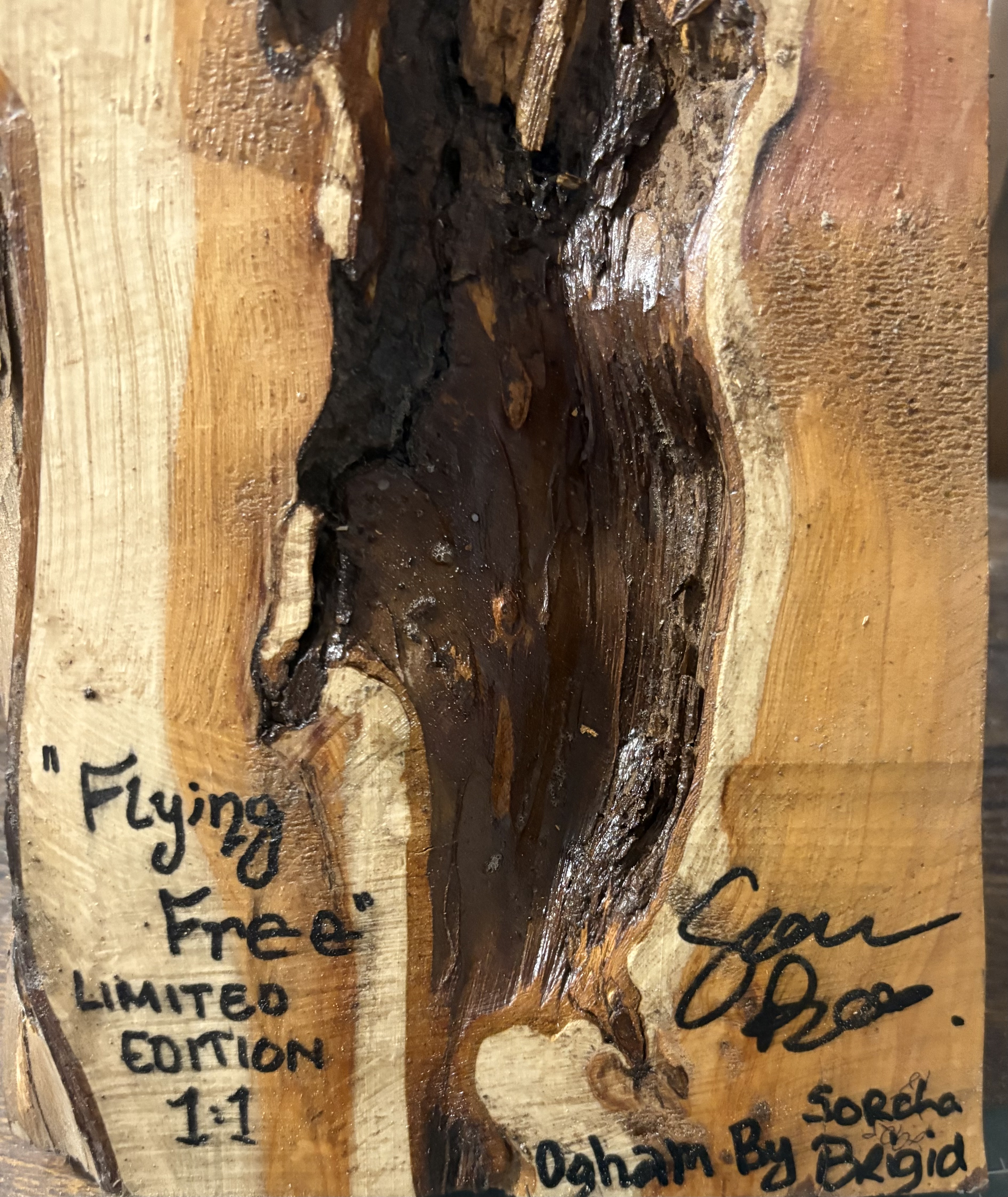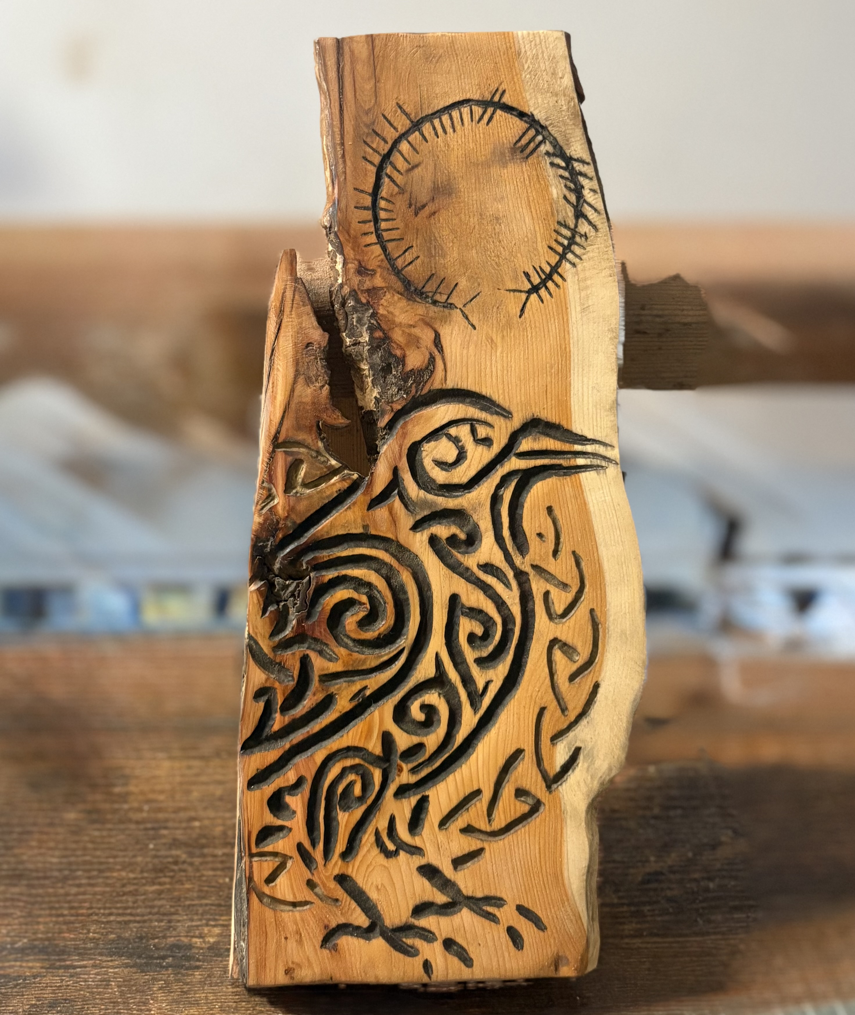 “Flying Free” Celtic Knot Raven Ogham on Yew “Flying Free” Celtic Knot Raven Ogham on Yew